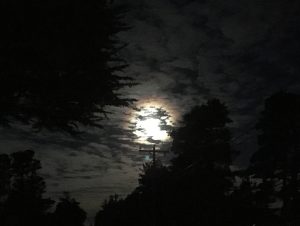I woke early to the sound of the garbage truck rumbling down the street. Shoot! I forgot to put the trash can out. I jumped out of bed, threw on my clothes, shoved my feet into boots, and ran out of the house. Headlights illuminated the dark street as I wheeled the can out. But when I got to the street there was no car. The light came from this morning moon: